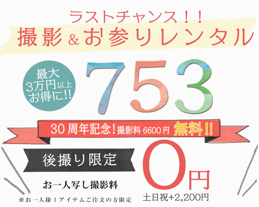 - 出来ます。衣装はもちろん事前に撮影プランを決めておくと、予算も把握できるし、撮影当日もお子様を待たせることなく、スムーズに進めることが出来ます。七五三相談会での事前打ち合わせを是非ご活用下さい。ただし、お参りシーズンになるとお出かけレンタルが優先になりますので、ご了承下さい。